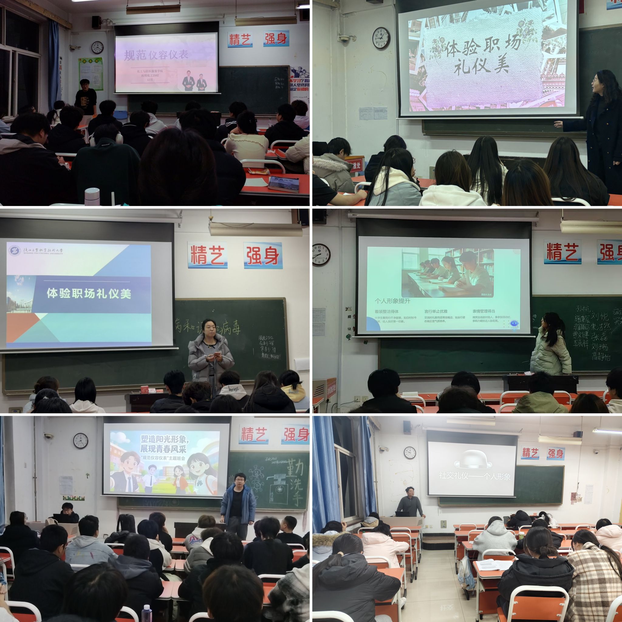 在实践过程中,2025级各班级积极创新,让礼仪学习突破传统课堂讲授的形式,呈现出多样态、沉浸式的新面貌。“学会校园礼仪美”与“提升社交礼仪美”成为各班重点实践内容。不少班级走出教室,在校园内开展“礼仪观察员”活动,学生分组记录礼仪行为与不文明现象,并在班会上交流讨论,共同制定《班级校园礼仪公约》。围绕“社交礼仪美”,外语类专业班级融入多语言问候环节,并设计“握手礼仪”“介绍他人”等互动游戏,帮助学生在轻松氛围中掌握不同社交场景的规范。此外,部分班级结合“成礼修身美”“传播文明礼仪美”主题,组织学生撰写心得、制作宣传海报,并在公告栏展示,带动更多同学关注礼仪、践行礼仪。