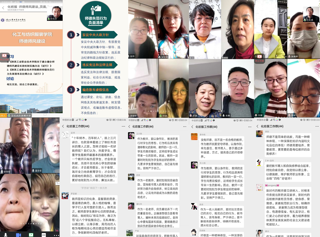 4月13日下午,化工与纺织服装学院党总支借助腾讯会议平台组织全体教职工召开视频会议,进行师德师风专题学习。学院全体教师参加了会议,会议由党总支书记王化冰主持。